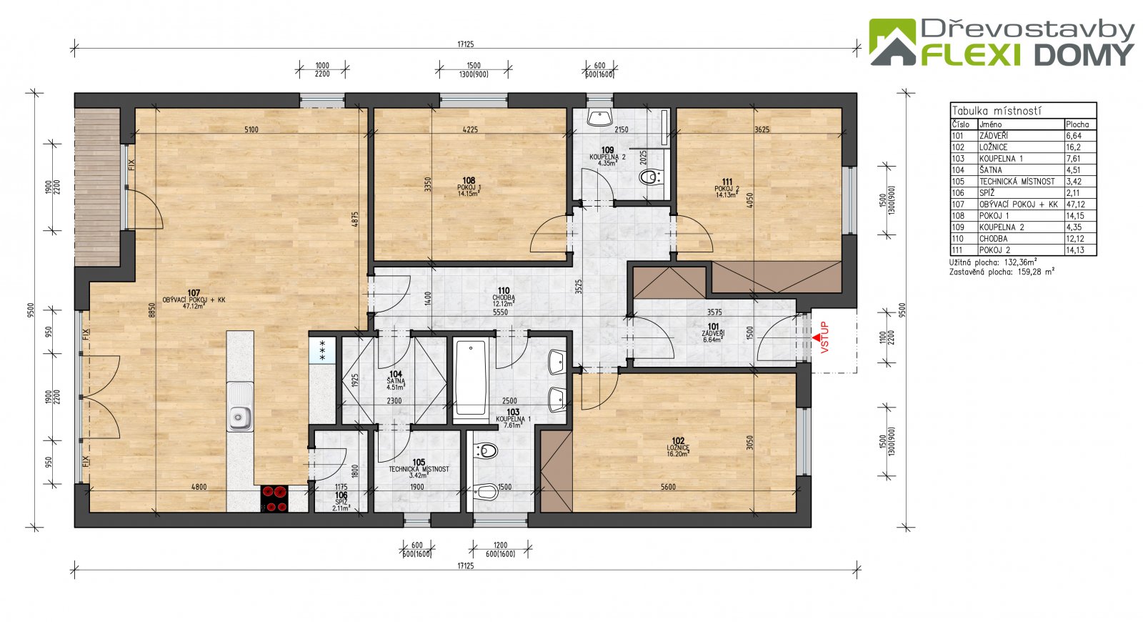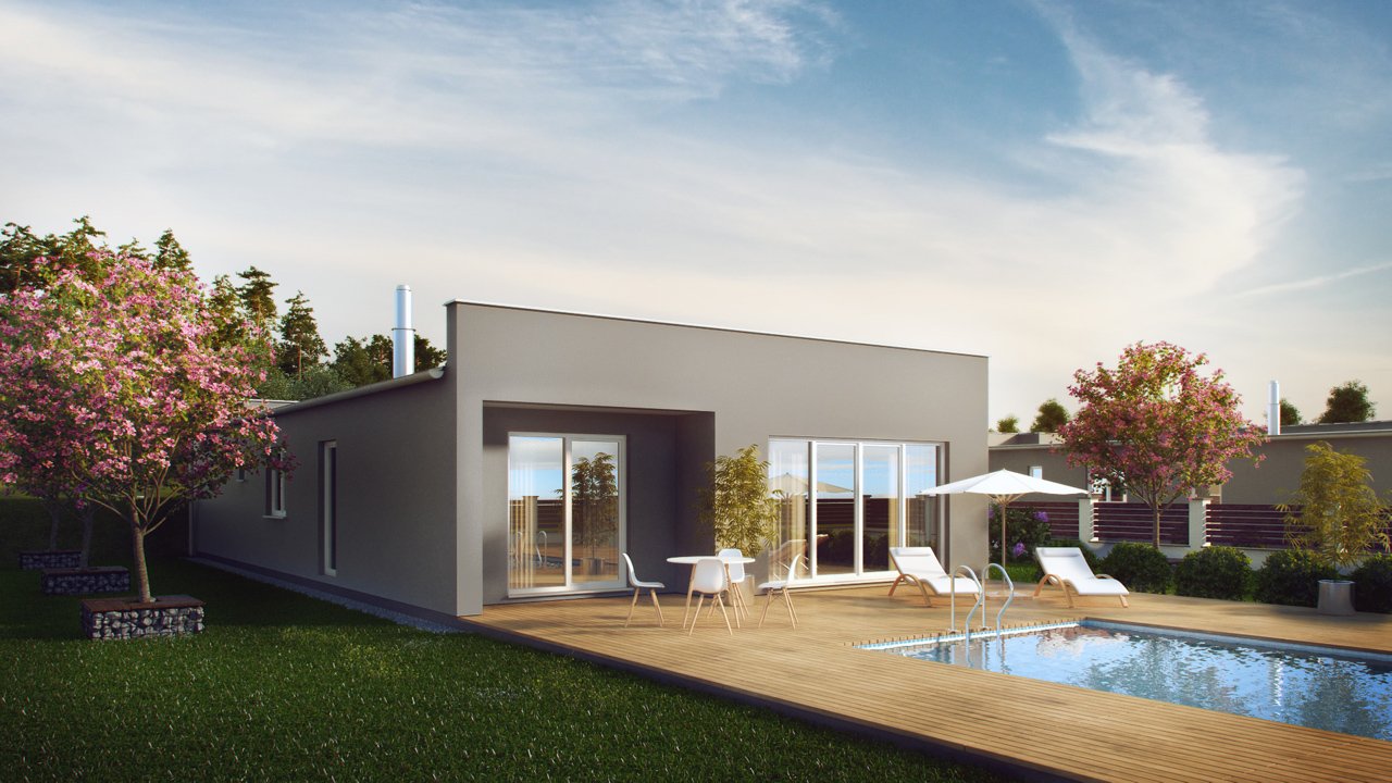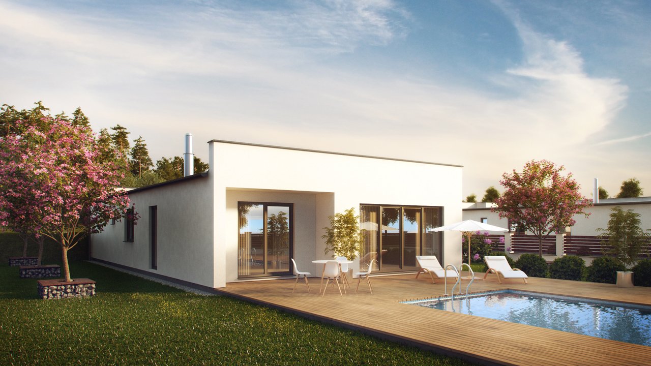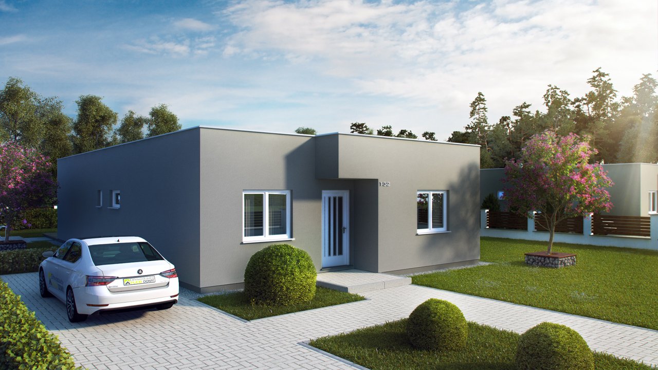 VILA 132 je praktický a moderní přízemní dům vhodný i na užší pozemky. Dům nabízí dostatek pro vestavěné šatny i technickou místnost. Obývací pokoj s velkými prosklenými plochami pokračuje vchodem na krytou terasu. Kuchyň může být řešena jako otevřená do obývací části nebo je možné ji oddělit příčkou. Příjemné prostředí obývací časti i kryté terasy dokreslují dva dominantní krby. Dům nabízí také dva neprůchozí pokoje, které můžete využít jako dětské ložnice, případně může jeden sloužit také jako pracovna.